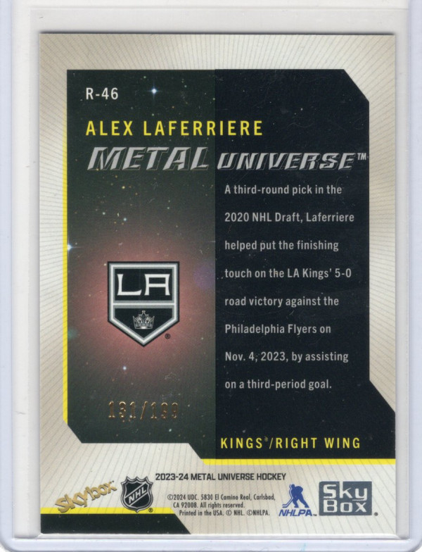 You are purchasing a 2023-24 SkyBox Metal Universe Alex Laferriere #R-46 131/199. You will receive the exact item in the photographs. Thank you for looking.