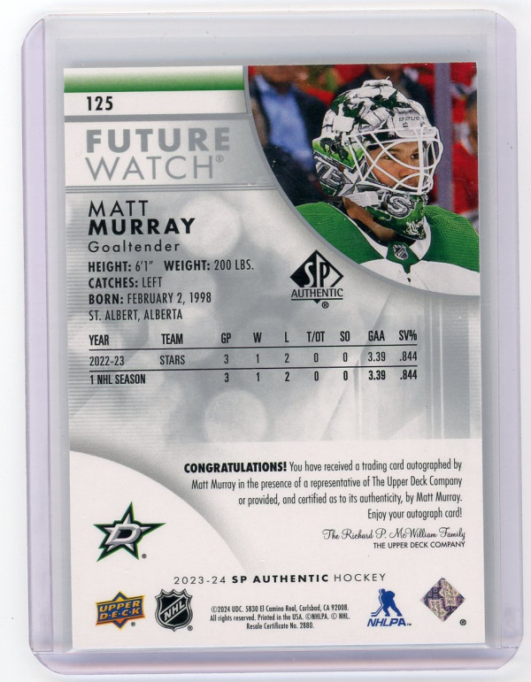 2023-24 SP Authentic Matt Murray Future Watch Autograph Rookie /999