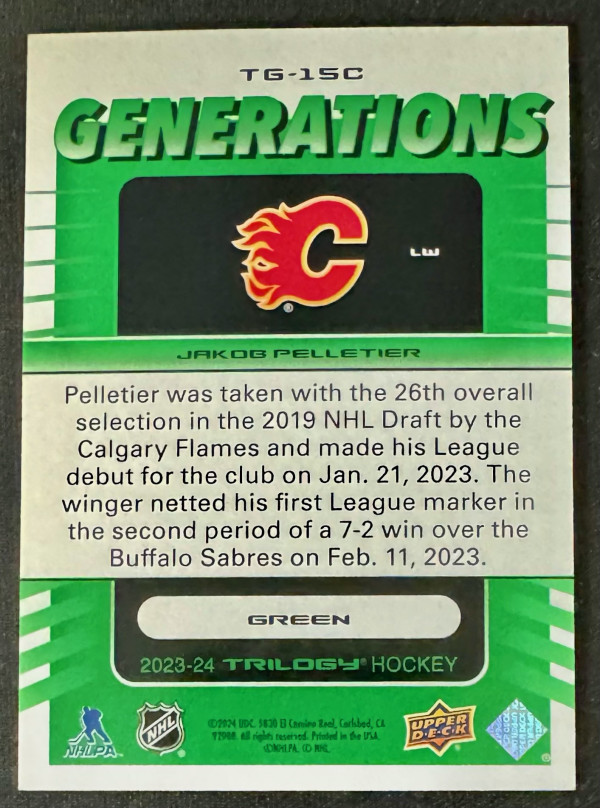 2023-24 Trilogy Jakob Pelletier Generations Green Rookie /99