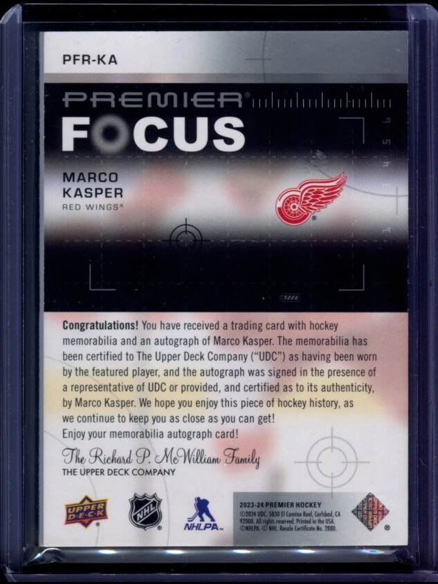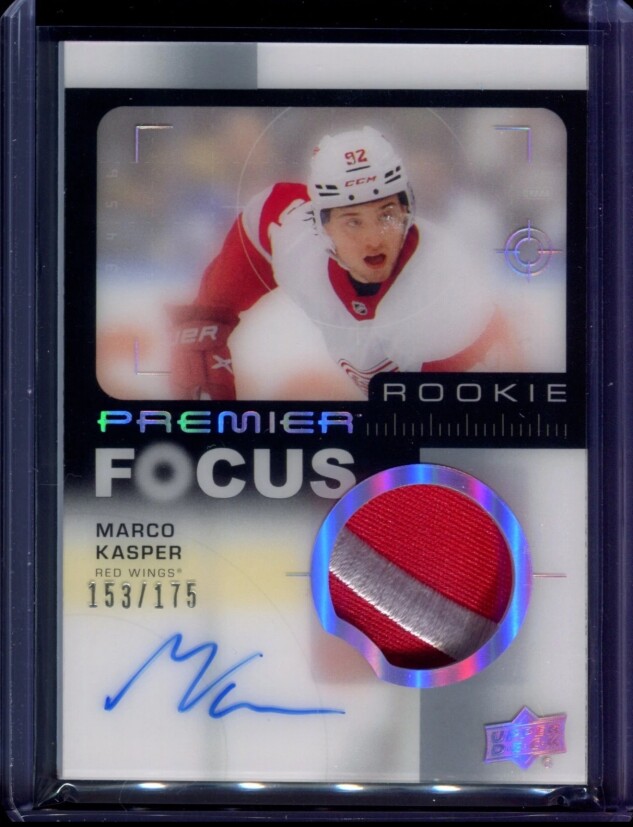2023-24 UD Premier Rookie Auto Patch Focus Marco Kasper /175 Detroit Red Wings