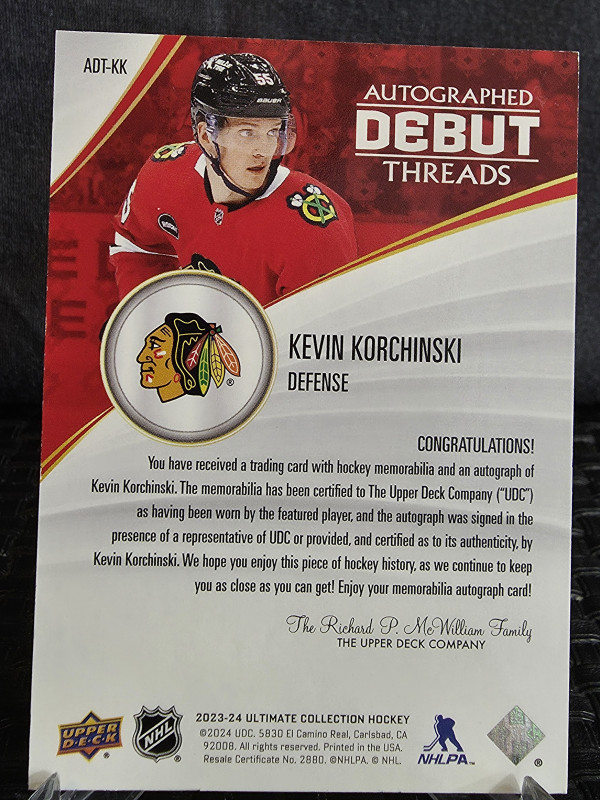 2023-24 ULTIMATE COLLECTION KEVIN KORCHINSKI #52/99 AUTO DEBUT THREADS RPA