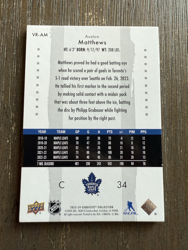 2023-24 Upper Deck Auston Matthews Exquisite Collection Base /299 #VR-AM