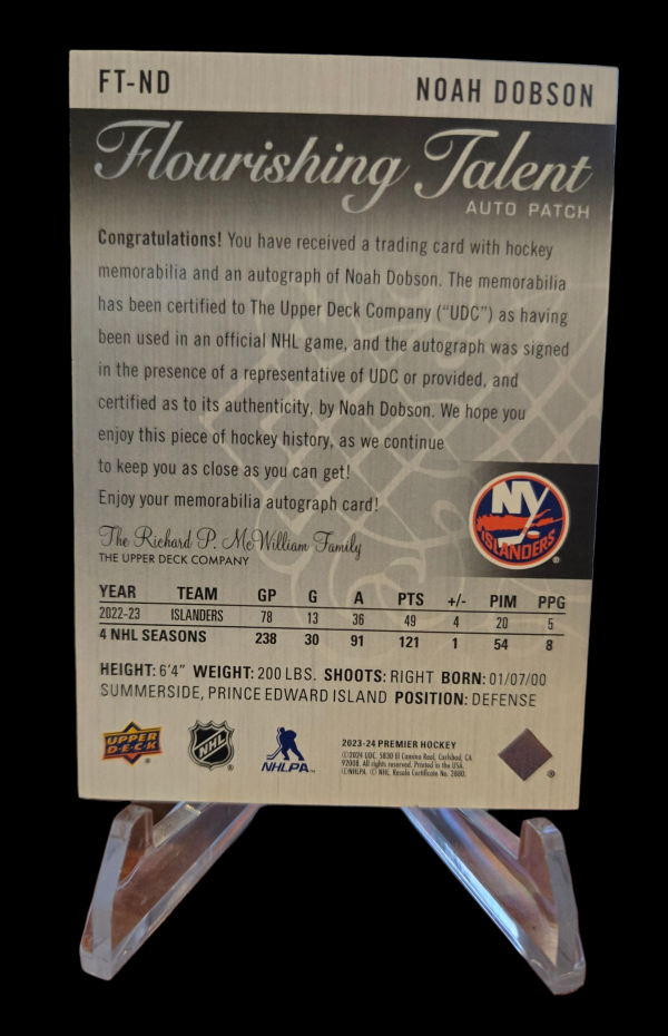 2023-24 Upper Deck Premier Flourishing Talent /99 Noah Dobson #FT-ND Patch Auto