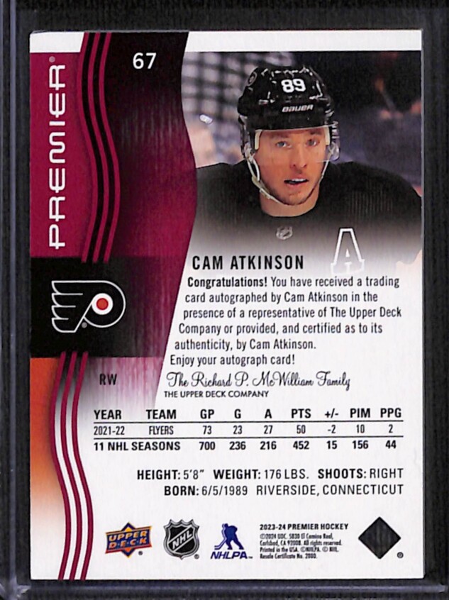 2023-24 Upper Deck Premier Hockey Cam Atkinson #67 Auto