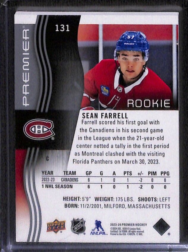 You are purchasing a 2023-24 Upper Deck Premier Hockey Sean Farrell #131 138/399 Rookie Excellent. You will receive the exact item in the photographs. Thank you for looking.