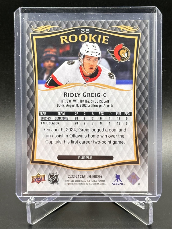 2023-24 Upper Deck Stature Ridley Greig Rookie Purple (18/25)