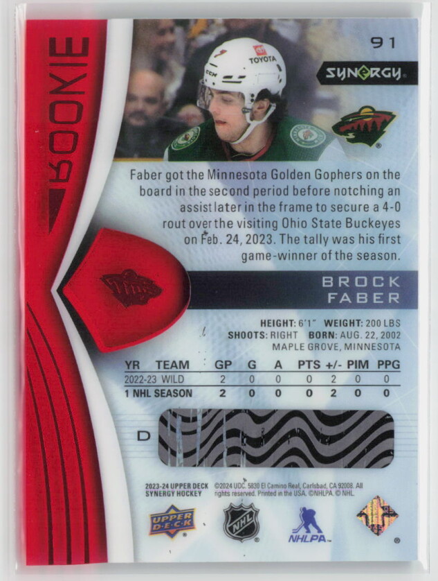 2023-24 Upper Deck Synergy Hockey Brock Faber #91 Rookie