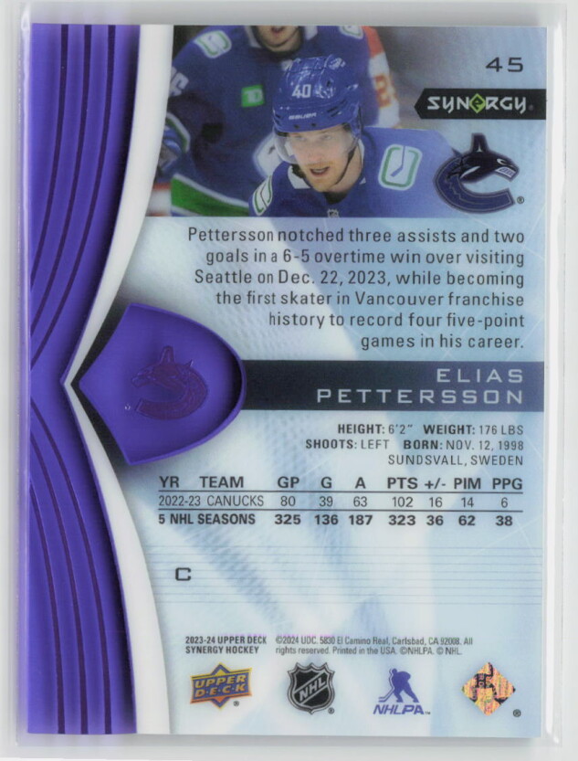 You are purchasing a 2023-24 Upper Deck Synergy Hockey Elias Pettersson #45 Purple 45/99. You will receive the exact item in the photographs. Thank you for looking.