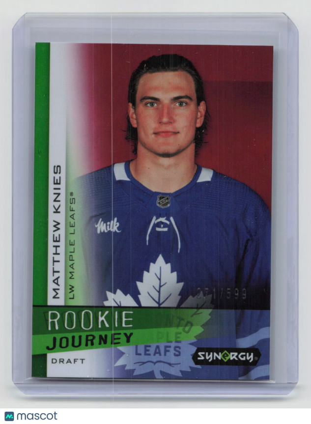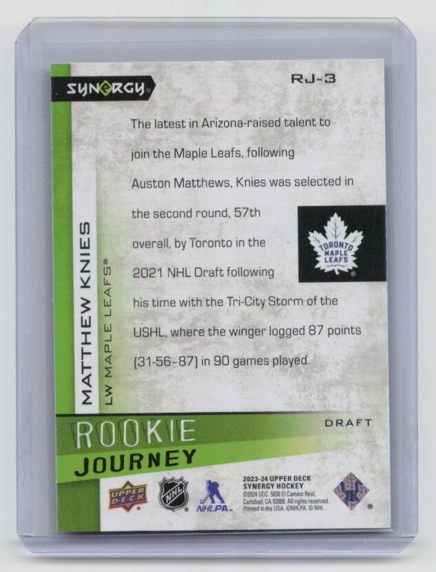You are purchasing a 2023-24 Upper Deck Synergy Hockey Rookie Journey Matthew Knies #RJ-3 Draft 271/599. You will receive the exact item in the photographs. Thank you for looking.