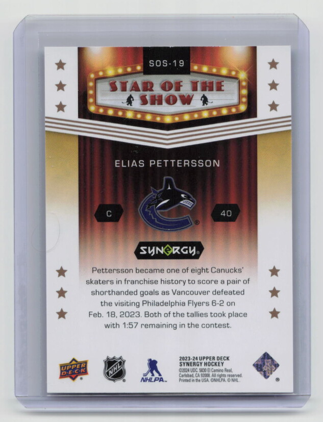 You are purchasing a 2023-24 Upper Deck Synergy Hockey Star of the Show Elias Pettersson #SOS-19 Insert. You will receive the exact item in the photographs. Thank you for looking.