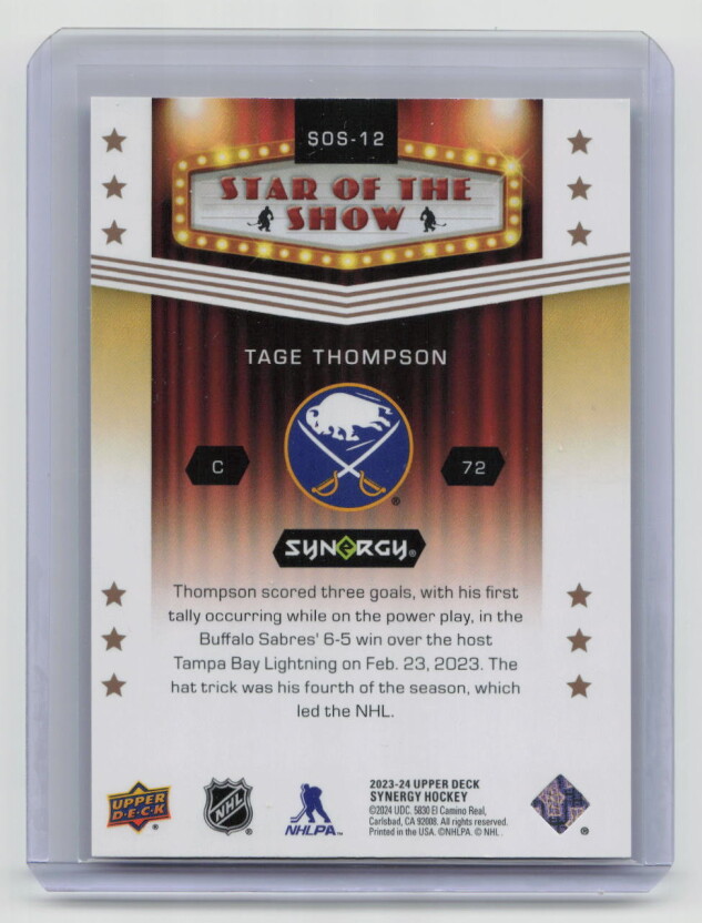 You are purchasing a 2023-24 Upper Deck Synergy Hockey Star of the Show Tage Thompson #SOS-12 Insert. You will receive the exact item in the photographs. Thank you for looking.