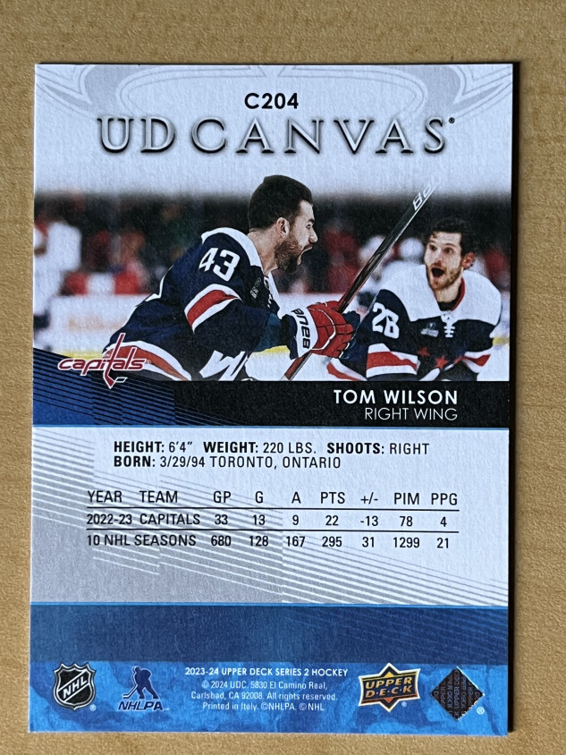 You are purchasing a 2023-24 Upper Deck UD Canvas #C204 Tom Wilson —VVCARDS—I do my best to assess the condition of the card and describe it accurately. Please review the pictures in the listing for condition as this is the exact card you will receive. The card is located in Canada and will be shipped using Canada Post. Thank you for looking.