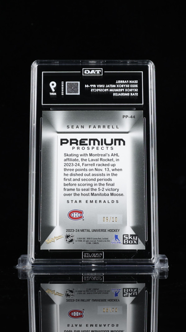 You are purchasing a 2023 Skybox Metal Universe Premium Prospects Sean Farrell #PP-44 Star Emeralds 09/10 Rookie TAG 9. You will receive the exact item in the photographs. Thank you for looking.