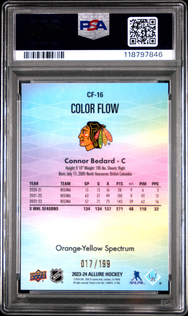 2023 Upper Deck Allure Color Flow Connor Bedard Color Flow-Org-Ylw Spctrm /199 PSA 9