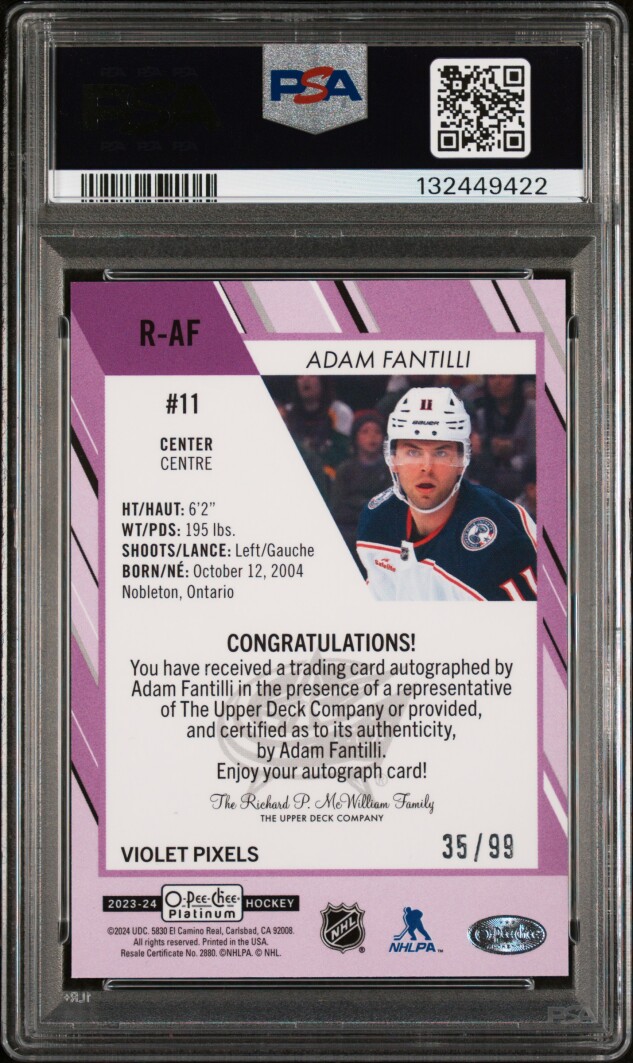 2023 Upper Deck O-Pee-Chee Platinum Rookie Autographs Adam Fantilli Rookie Auto-Violet Pixels