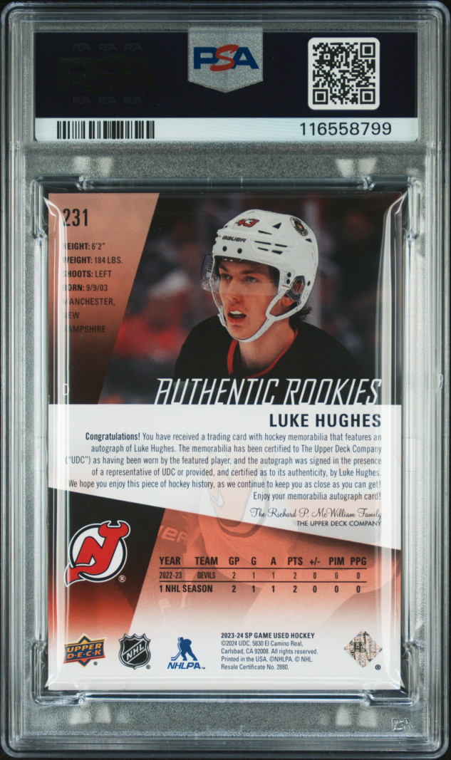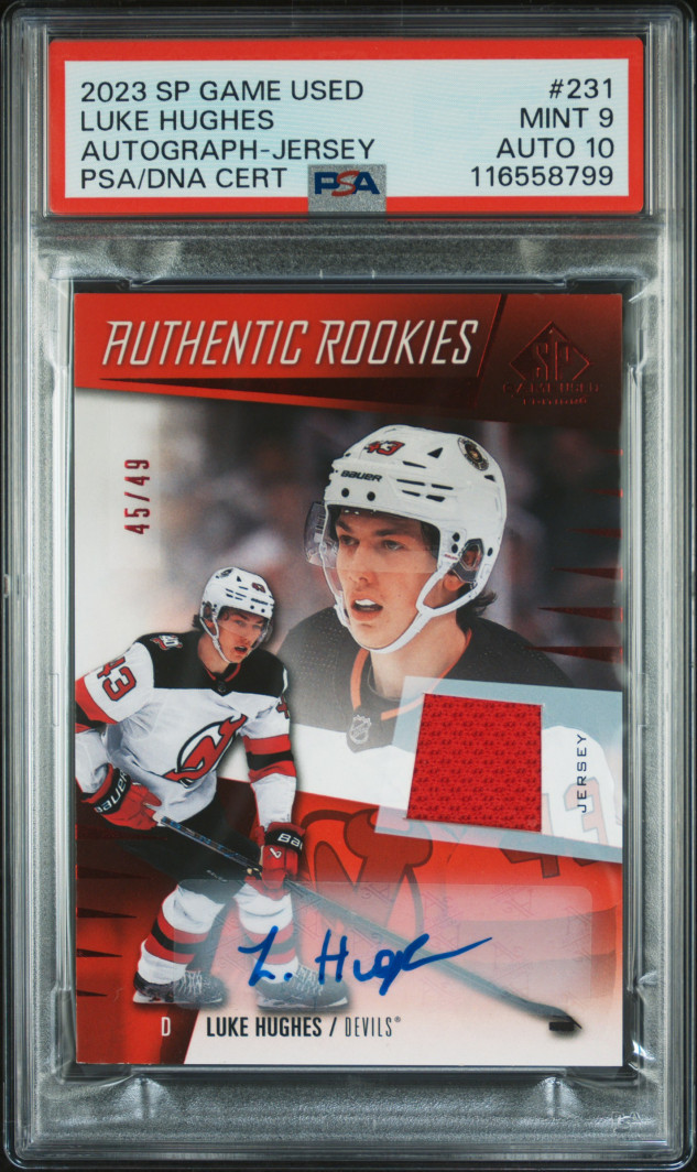 2023 Upper Deck Sp Game Used Luke Hughes Autograph-Jersey /49 PSA 9 Auto 10