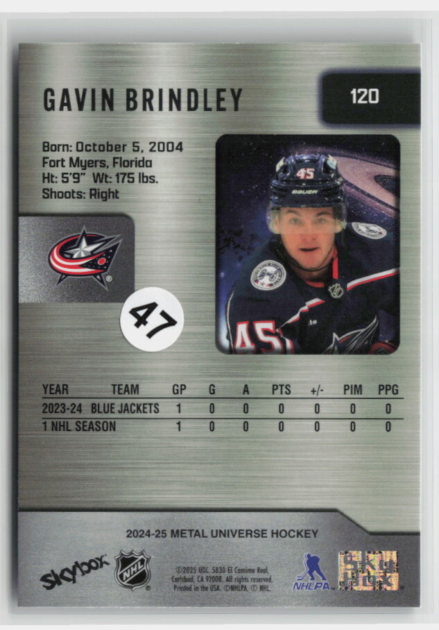 You are purchasing a 2024-25 Metal Universe Hockey Gavin Brindley #120 Rookie. You will receive the exact item in the photographs. Thank you for looking.
