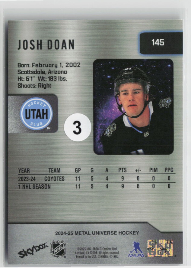 You are purchasing a 2024-25 Metal Universe Hockey Josh Doan #145 Rookie. You will receive the exact item in the photographs. Thank you for looking.
