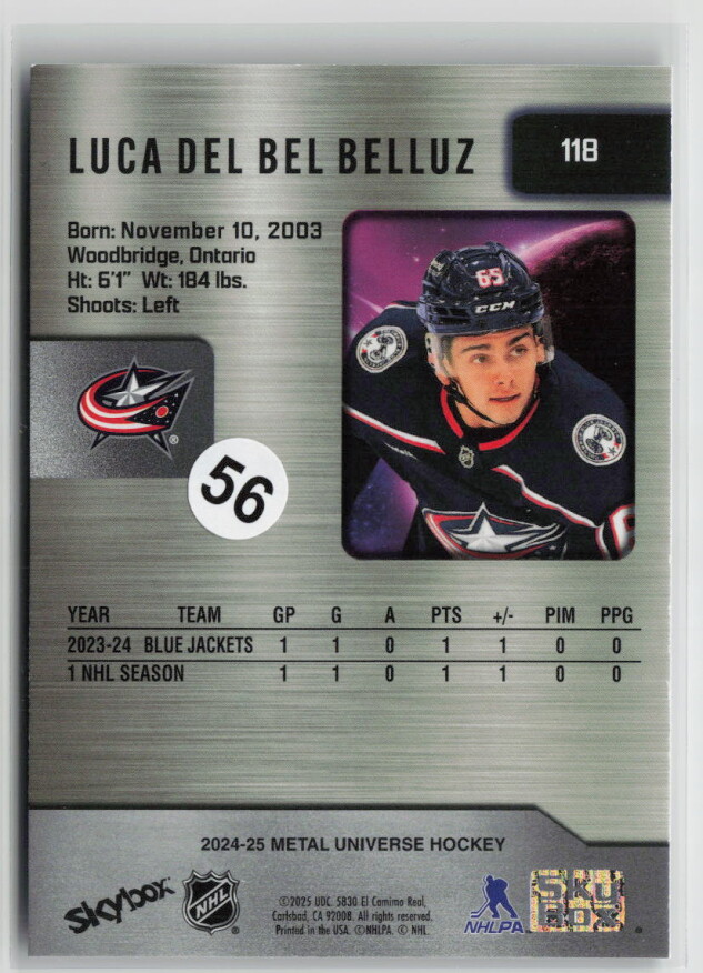 You are purchasing a 2024-25 Metal Universe Hockey Luca Del Bel Belluz #118 Rookie. You will receive the exact item in the photographs. Thank you for looking.