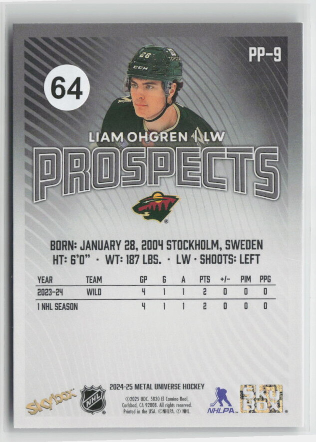 You are purchasing a 2024-25 Metal Universe Hockey Prospects Liam Ohgren #PP-9. You will receive the exact item in the photographs. Thank you for looking.