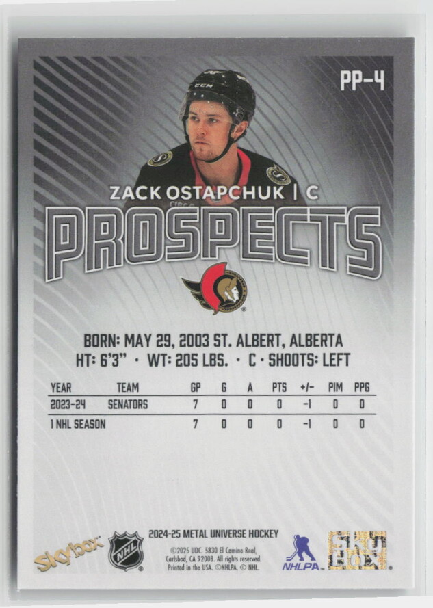 You are purchasing a 2024-25 Metal Universe Hockey Prospects Zack Ostapchuk #PP-4. You will receive the exact item in the photographs. Thank you for looking.