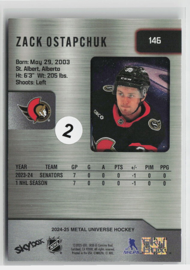 You are purchasing a 2024-25 Metal Universe Hockey Zack Ostapchuk #146 Rookie. You will receive the exact item in the photographs. Thank you for looking.