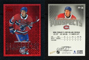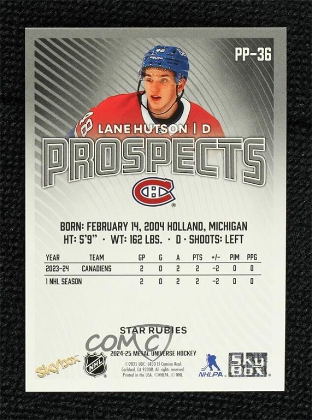 You are purchasing a 2024-25 Skybox Metal Universe - Premium Prospects - Star Rubies Lane Hutson #PP-36 Star Rubies 34/50. You will receive the exact item in the photographs. Thank you for looking.