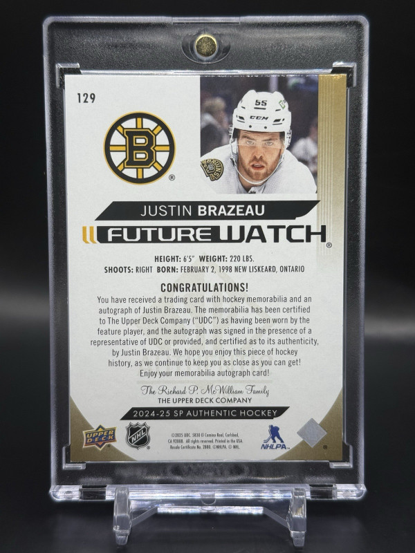 2024-25 SP Authentic Justin Brazeau Future Watch Auto Patch /100 FWAP RC #129