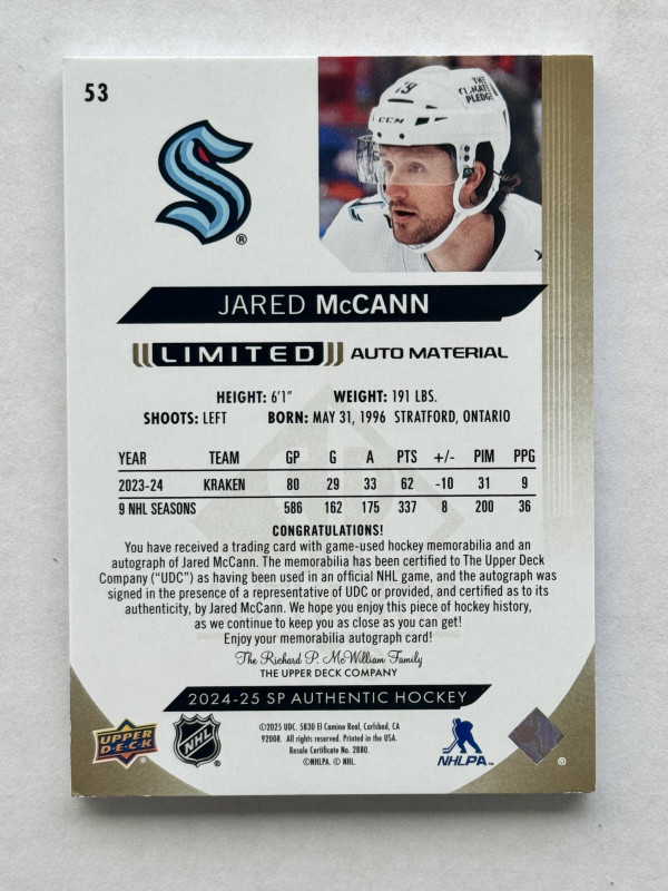 2024-25 Sp Authentic Limit Auto Material Glove - Jared McCann /100