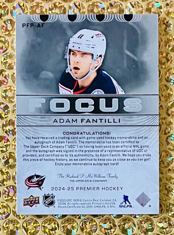 2024-25 UD Premier #PFP-AF Adam Fantilli Premier Focus 3-Color Auto Patch /49