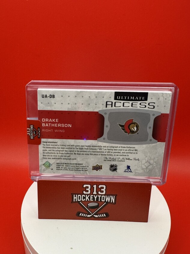 You are purchasing a 2025 2024-25 Ultimate Collection Drake Batherson #UA-DB Premium Patch Short Print Parallel/Variety Rookie Chase Exclusive Memorabilia Insert Upper Deck. You will receive the exact item in the photographs. Thank you for looking.