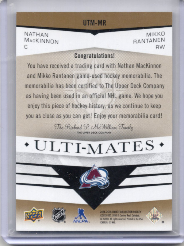 2024-25 Ultimate Ulti-Mates Patch Parallel Nathan MacKinnon/Mikko Rantanen 38/49