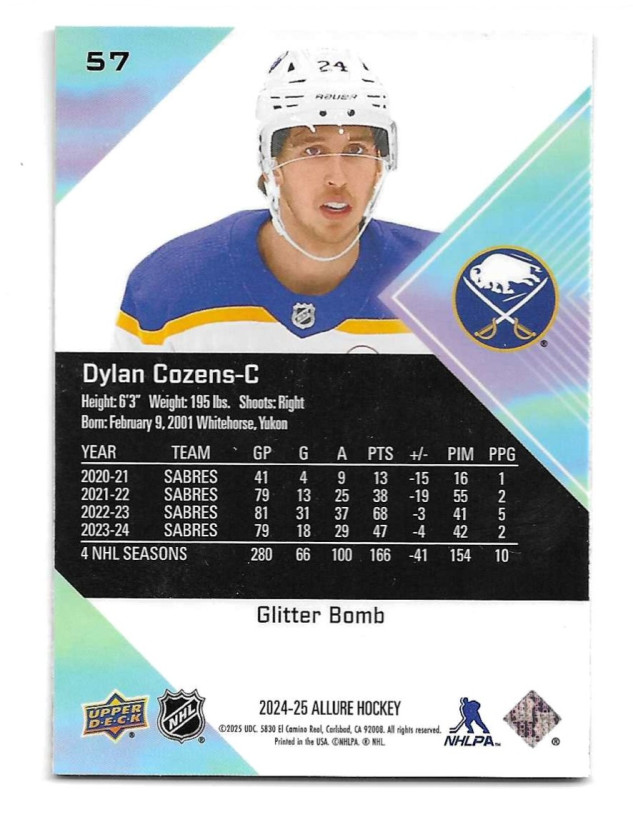 2024-25 Upper Deck Allure Glitter Bomb #57 Dylan Cozens - Buffalo Sabres (