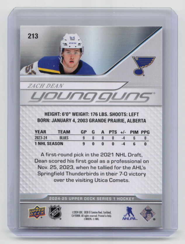 You are purchasing a 2024-25 Upper Deck Series 1 Young Guns Zach Dean #213. You will receive the exact item in the photographs. Thank you for looking.