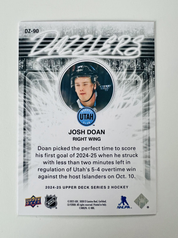 You are purchasing a 2025 2024-25 Upper Deck Series 2 Dazzlers Josh Doan Green Rookie. You will receive the exact item in the photographs. Thank you for looking.
