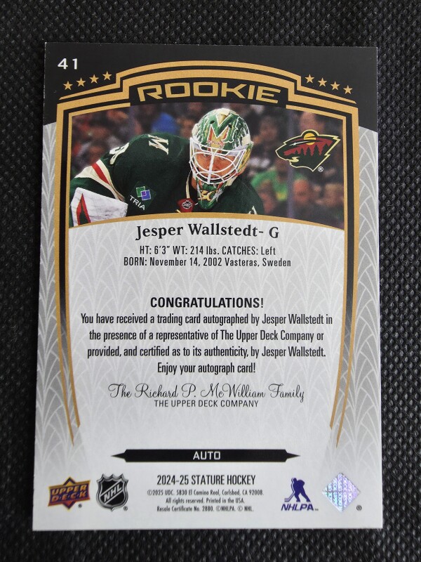 2024-25 Upper Deck Stature Rookie Jesper Wallstedt #41 Auto