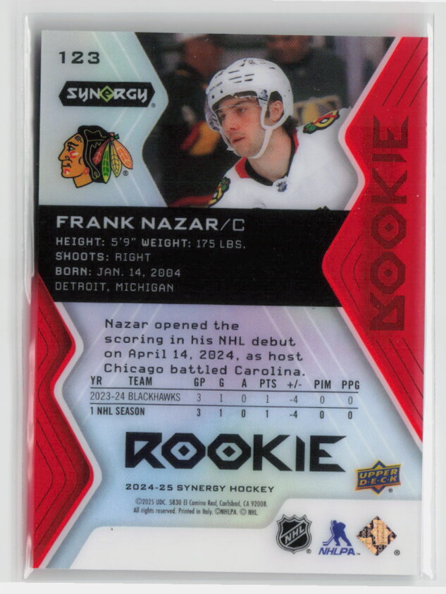 You are purchasing a 2024-25 Upper Deck Synergy Hockey Frank Nazar #123 Rookie Excellent. You will receive the exact item in the photographs. Thank you for looking.