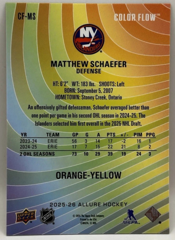 2025-26 ALLURE MATTHEW SCHAEFER ORANGE YELLOW COLOR FLOW ROOKIE RC