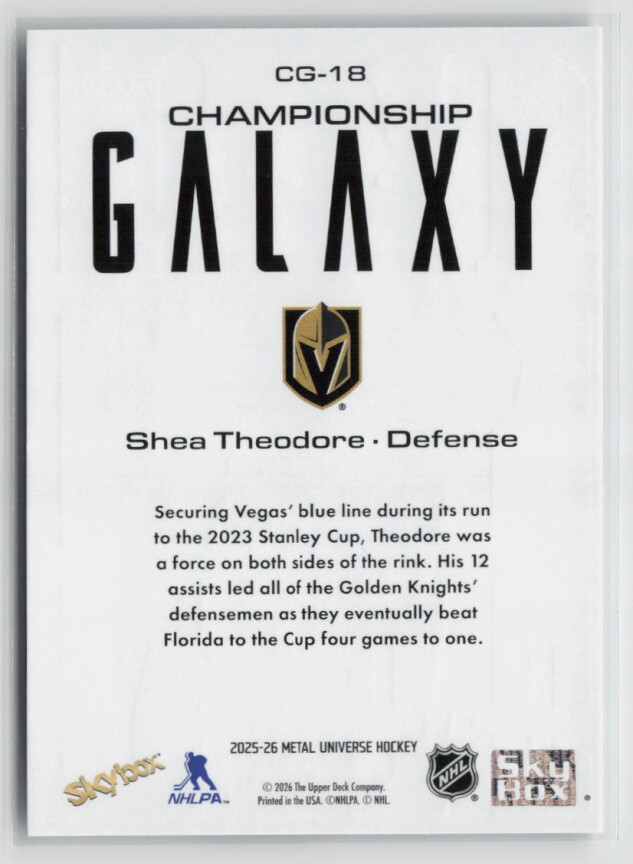 You are purchasing a 2025-26 SkyBox Metal Universe Hockey Championship Galaxy Shea Theodore #CG-18 Near Mint or Better. You will receive the exact item in the photographs. Thank you for looking.