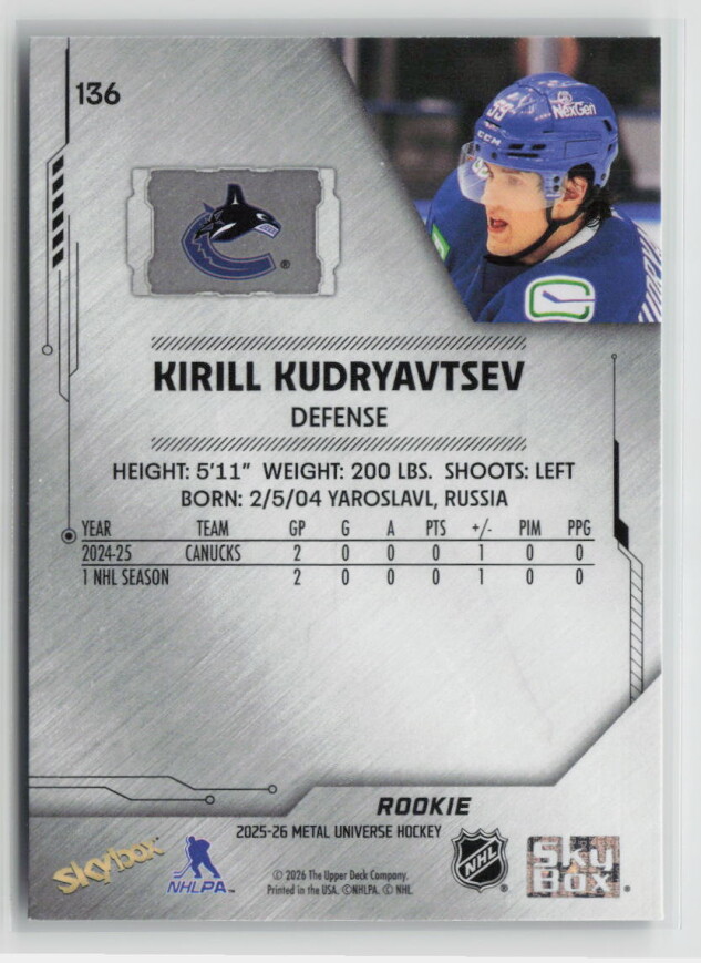 You are purchasing a 2025-26 SkyBox Metal Universe Hockey Kirill Kudryavtsev #136 Rookie Excellent. You will receive the exact item in the photographs. Thank you for looking.