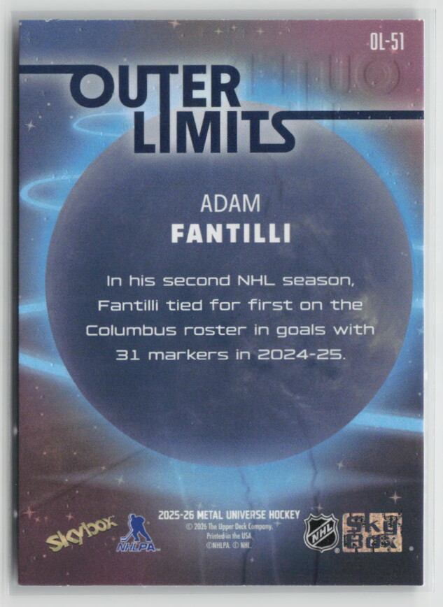 You are purchasing a 2025-26 SkyBox Metal Universe Hockey Outer Limits Adam Fantilli #OL-51 Excellent. You will receive the exact item in the photographs. Thank you for looking.