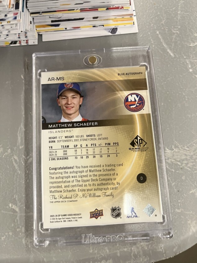 You are purchasing a 2025-26 UPPER DECK SP GAME USED Matthew Schaefer Blue Autograph Short Print Rookie Upper Deck. You will receive the exact item in the photographs. Thank you for looking.