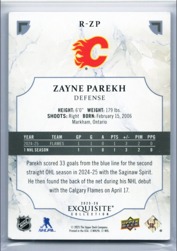 2025-26 UD Black Diamond #R-ZP Zayne Parekh Exquisite Collection Rookies #/399