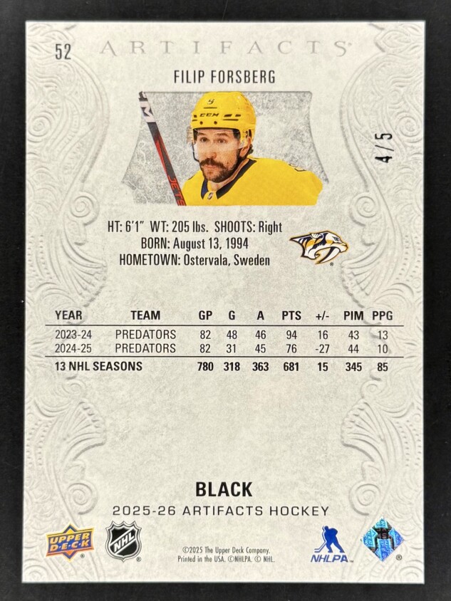 A very rare super short print of the Preds Assistant Captain Filip Forsberg 4 of5 made in the Black parallel