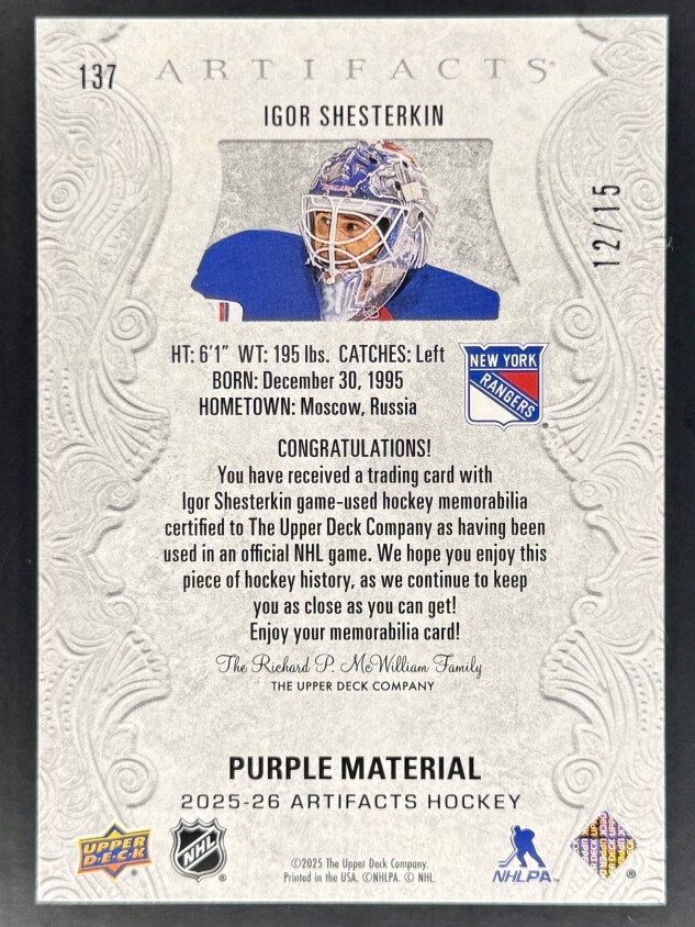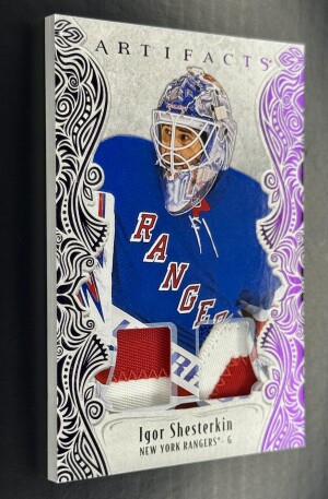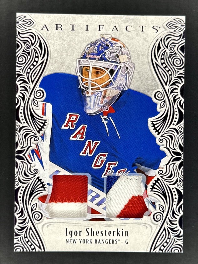 Beautiful blue white and red patches, possibly one of the “RANGERS” letters from the front of the jersey. Only 15 of these cards exist with this super short print being number 12 of 15.