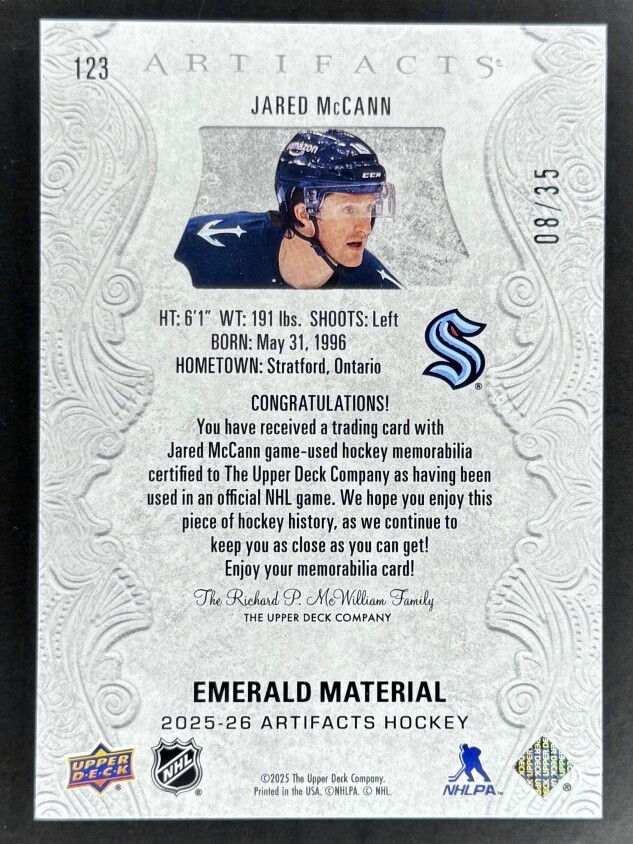 Tri coloured patch combo, Jared seems to just better with age, has been great for Seattle. Only 35 of his Emerald Material (game used) cards