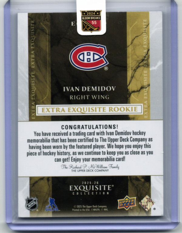 2025-26 Upper Deck Black Diamond Extra Exquisite Rookie Jersey IVAN DEMIDOV /349