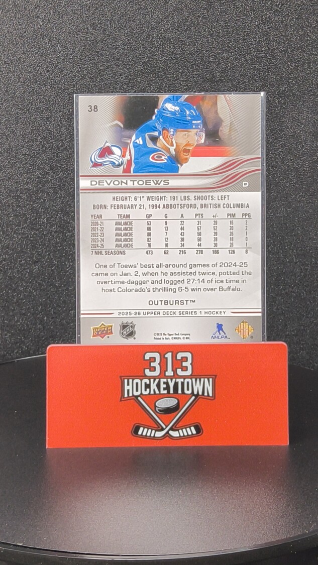 You are purchasing a 2025-26 Upper Deck Series 1 Outburst Devon Toews #38 Silver. You will receive the exact item in the photographs. Thank you for looking.