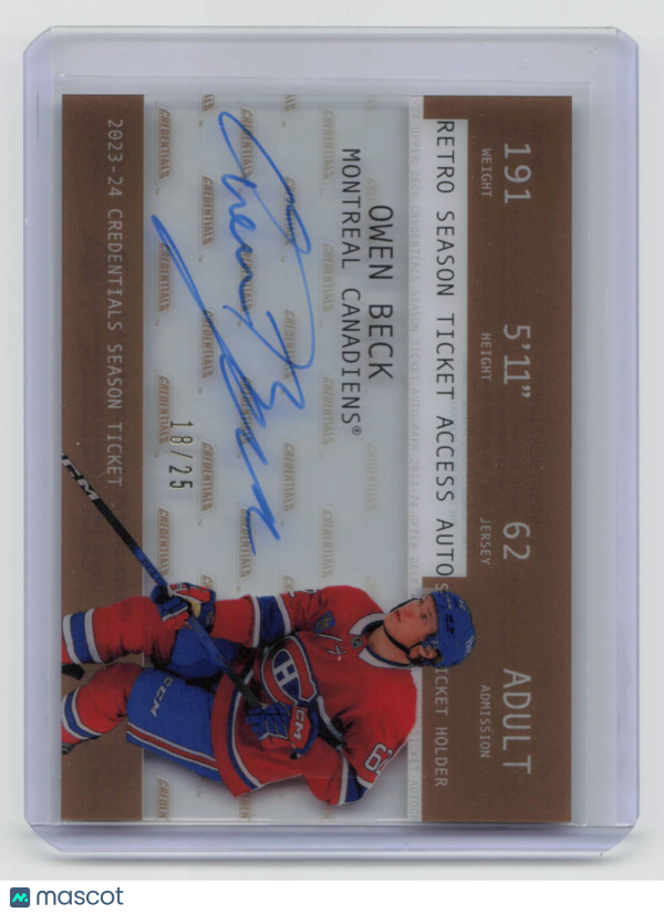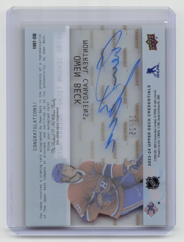 You are purchasing a 2025 Upper Deck Credentials Retro Season Ticket Access Auto Owen Beck Gold Rookie 18/25. You will receive the exact item in the photographs. Thank you for looking.