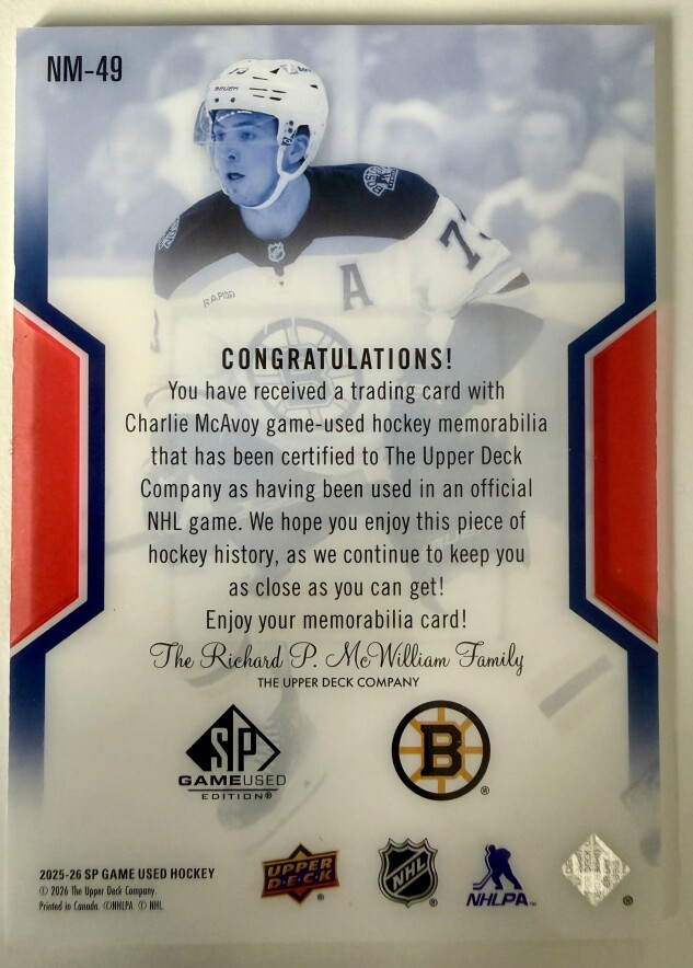 You are purchasing a 2025 Upper Deck SP Game Used NHL Masters Charlie McAvoy 050/199 Game-Used Hockey Memorabilia. You will receive the exact item in the photographs. Thank you for looking.